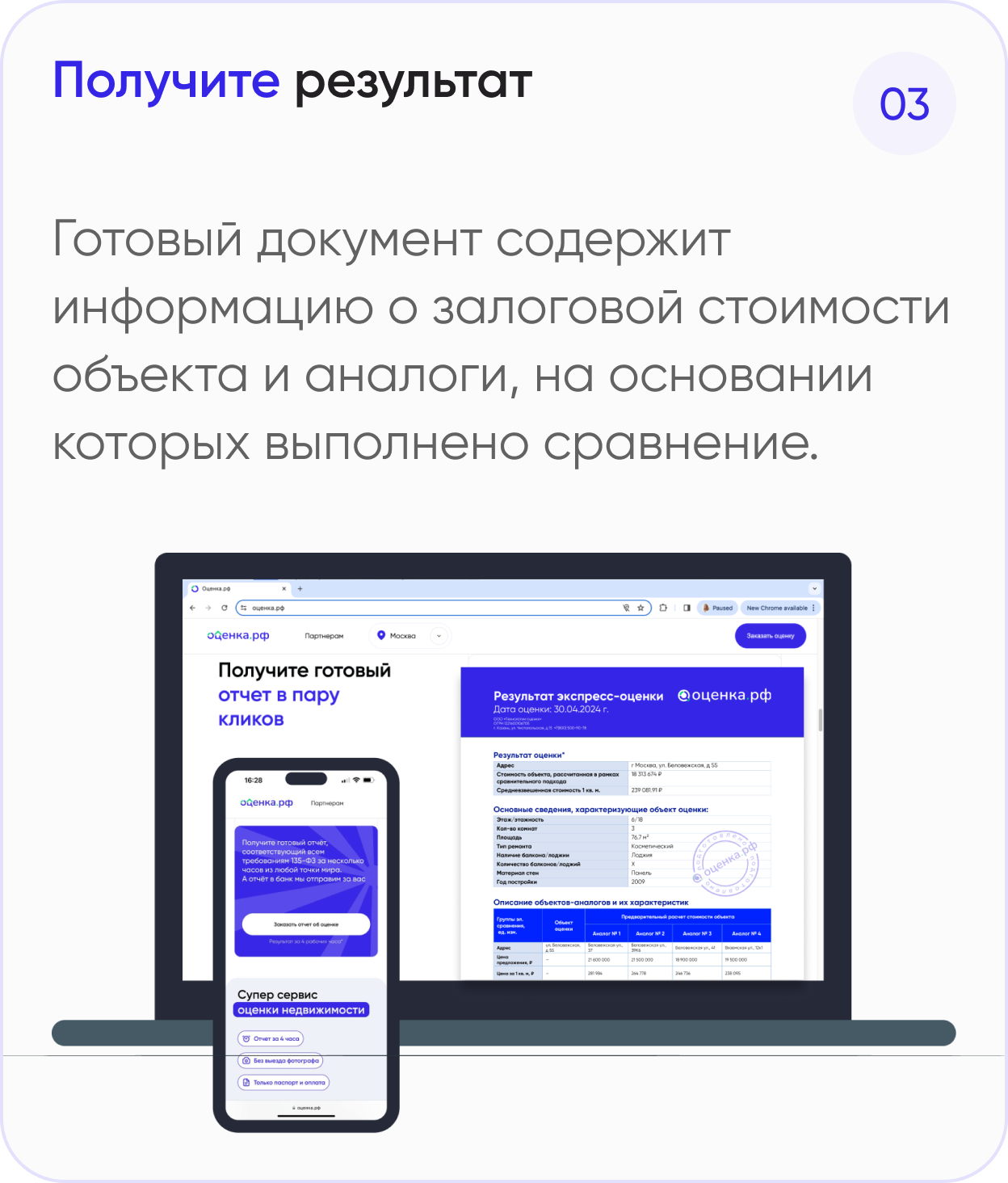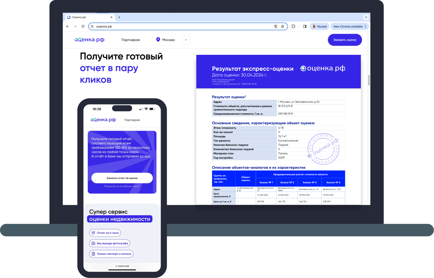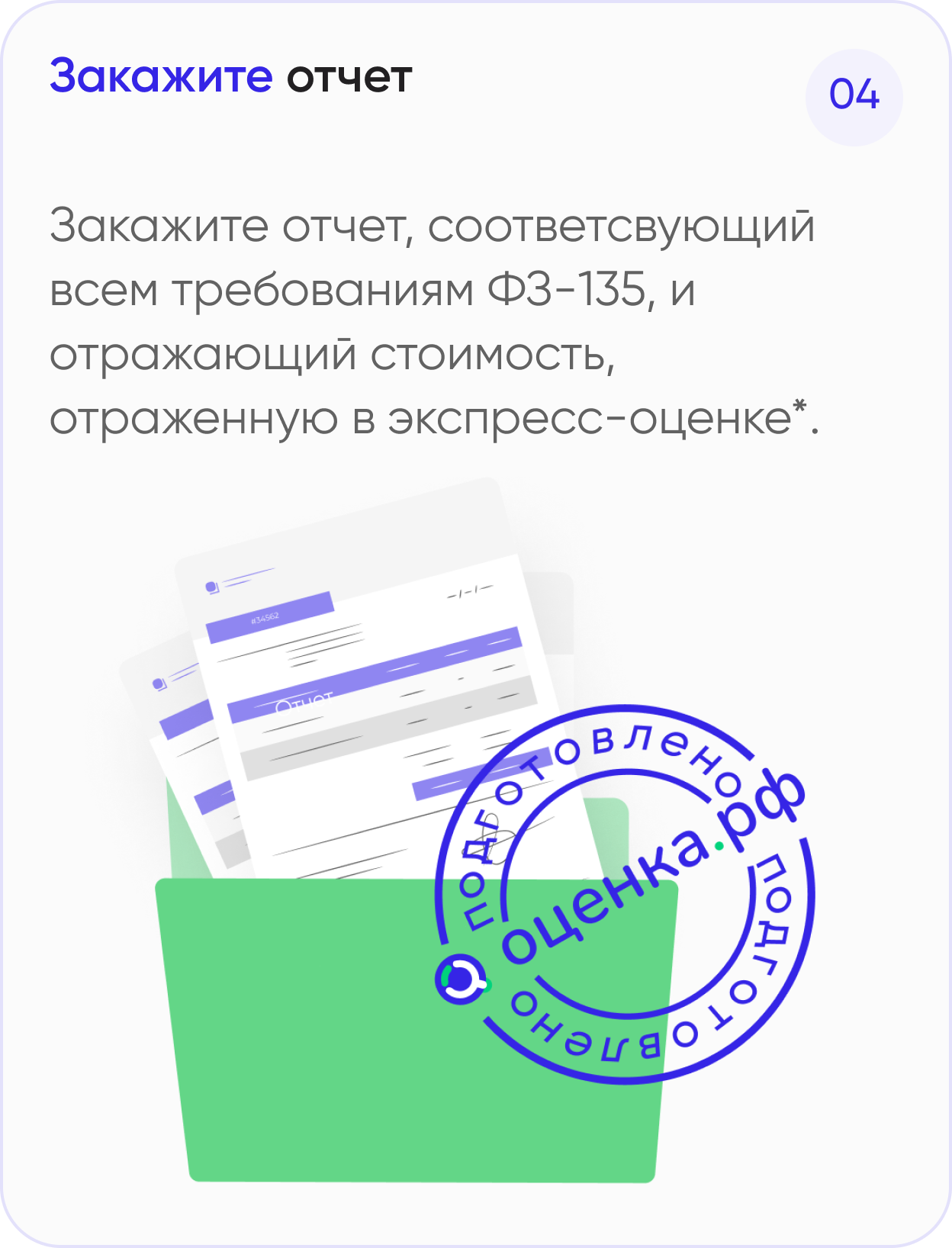 На нашем сайте вы можете заказать экспресс-расчет для квартиры. Если вам нужно оценить другие объекты, такие как кладовые, комнаты, дома и участки (ИЖС), машиноместа и прочее, вы можете сделать это через сайт оценка.рф, по телефону +7 800 500 90 78 или по электронной почте: service@ocenka.tech.
